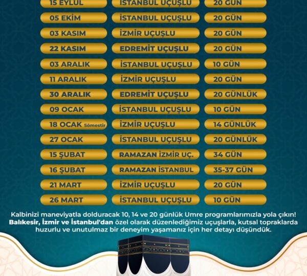 ✅ 7.TUR – 30 ARALIK (Edremit Uçuşlu – 20 Gün Sömestr Umre)