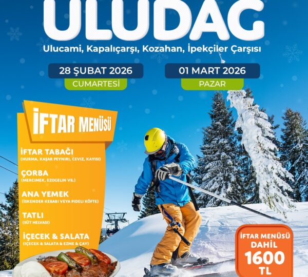 Ramazan ayının manevi huzurunu, Uludağ’ın bembeyaz doğası ve Bursa’nın tarihi atmosferi ile birleştiriyoruz… Hem doğa, hem tarih, hem ibadet, hem de lezzet dolu unutulmaz bir gün sizleri bekliyor. Ramazanın bereketini birlikte paylaşmak, Uludağ’ın beyazında huzuru hissetmek ve Bursa’nın tarih kokan sokaklarında geçmişe yolculuk yapmak isterseniz bu tur tam sizin için.